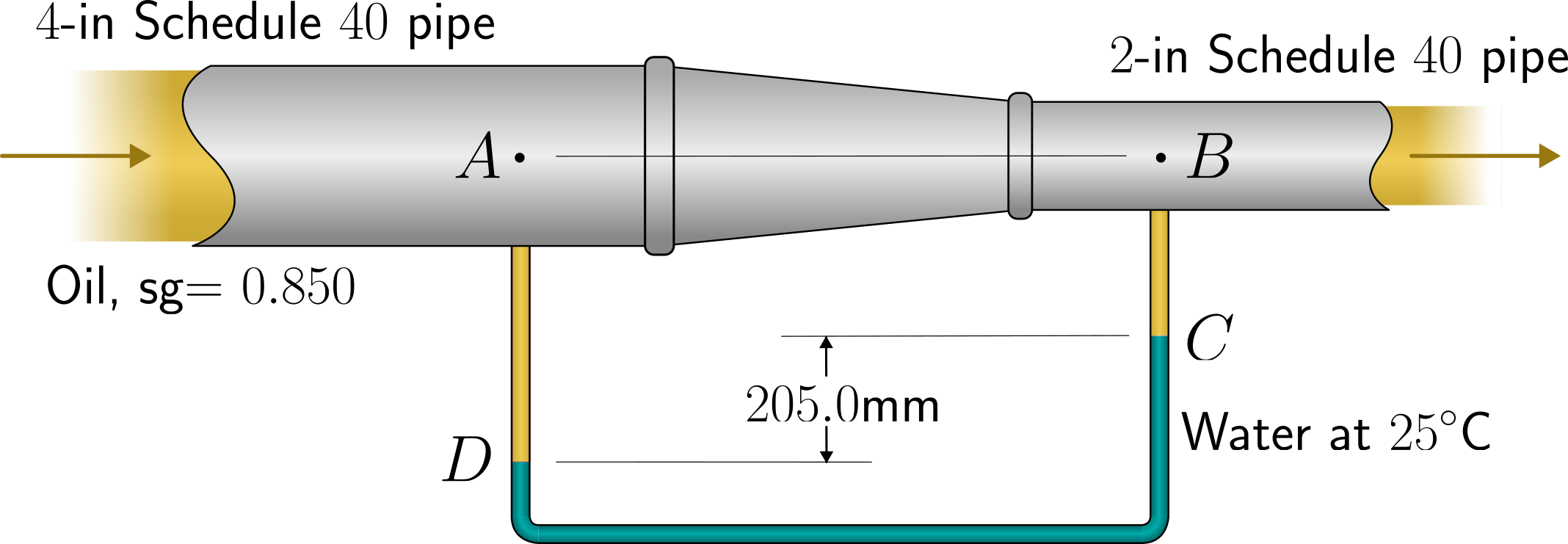 Determine the volume flow rate of oil, with sg=0.850, in the system that flows from point A to point B given that the gauge fluid is water. Assume that the temperature is 25°C.